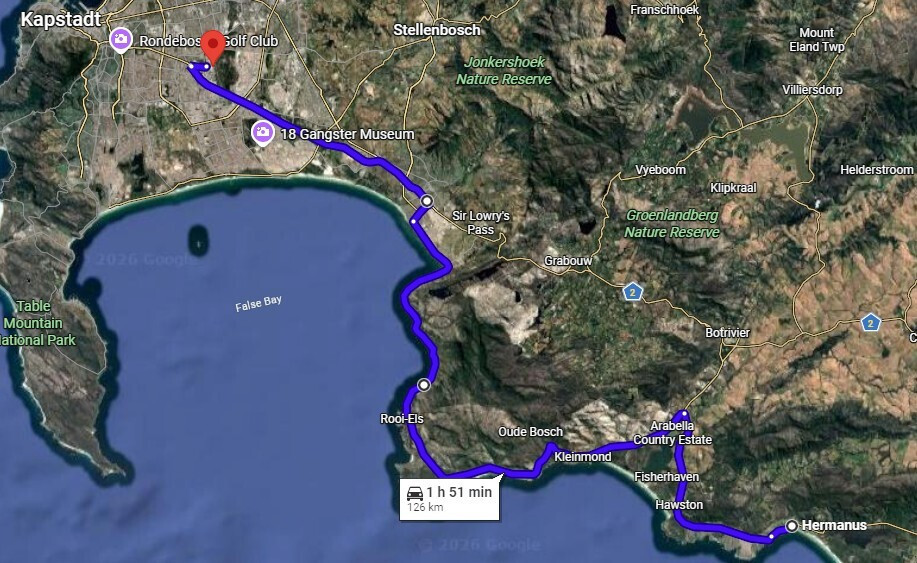 Unsere Reise begann entspannt mit Condor von Zürich über Frankfurt nach Kapstadt. Unsere Reiseleiterin Erica holte uns am Flughafen ab und los ging es der Südküste entlang nach Hermanus.